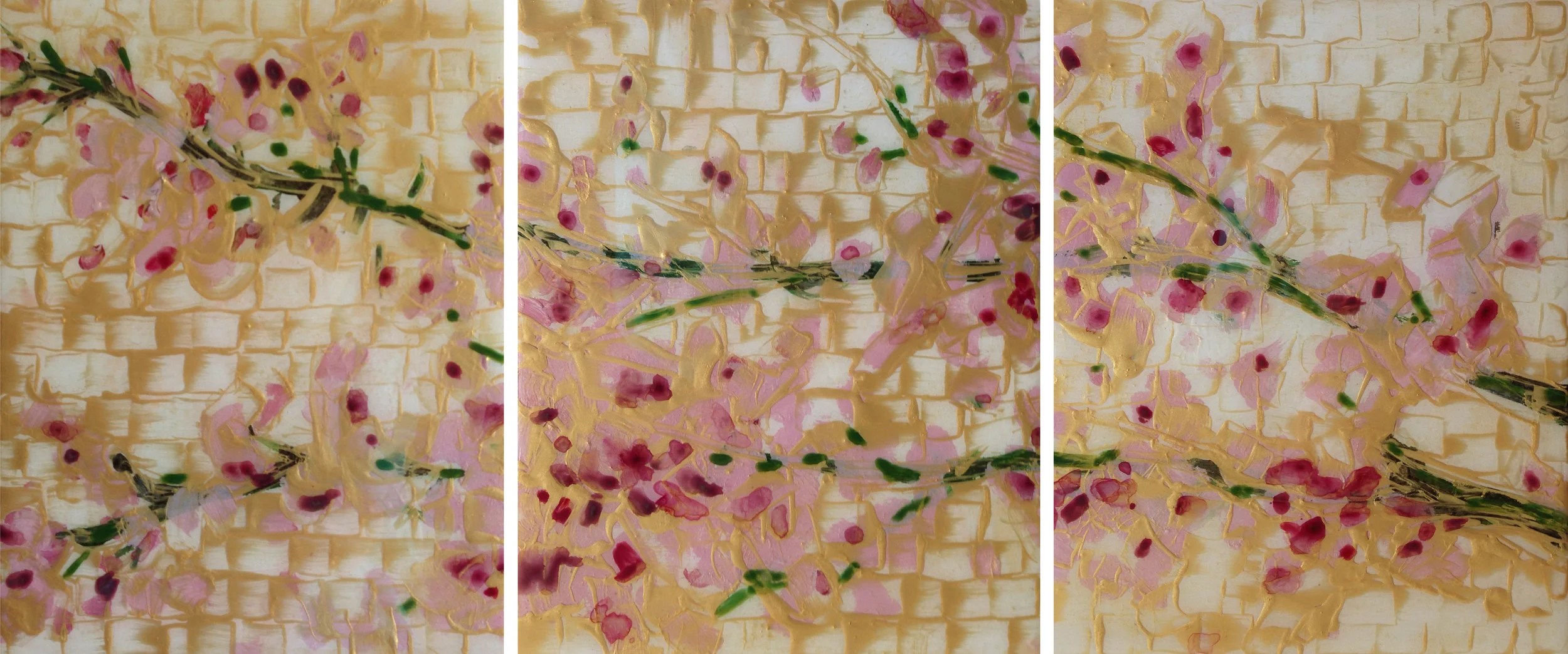 "Cherry Branch Triptych", mixed media on panel, 10" x 26"